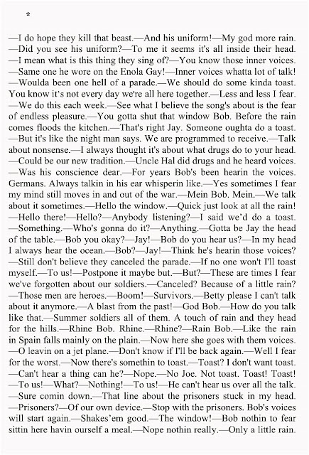 There’s something about punctuation – not points on a page but the way words cut and slip through other words, the way it sounds to be alive and seeing. Prose steps in where lyric can’t, here, poemwise; it’s less like looking through a microscope, more like standing in the middle of a busy street with a blindfold on. A good prose poet is always all ears. Nardone in this poem is doing great things with sound and with that kind of punctuation. We can hear family, TV, dinner- and dish-sounds, plus something else (“—Coffee? Tea?—Coffee.—Coffee!—Coffee.—Coffee.—Cream? Sugar?—A dreamworld. A cartoon.—Both”) coming through the edges. There’s an understanding here of the way said and unsaid start and stop each other, how there’s always something heard plus something pulling what you hear. Which is why this poem. And which is maybe why prose poetry in general. Just a theory.