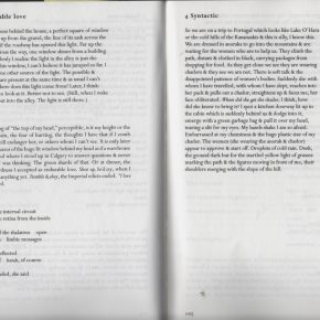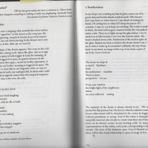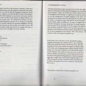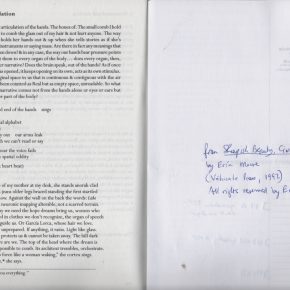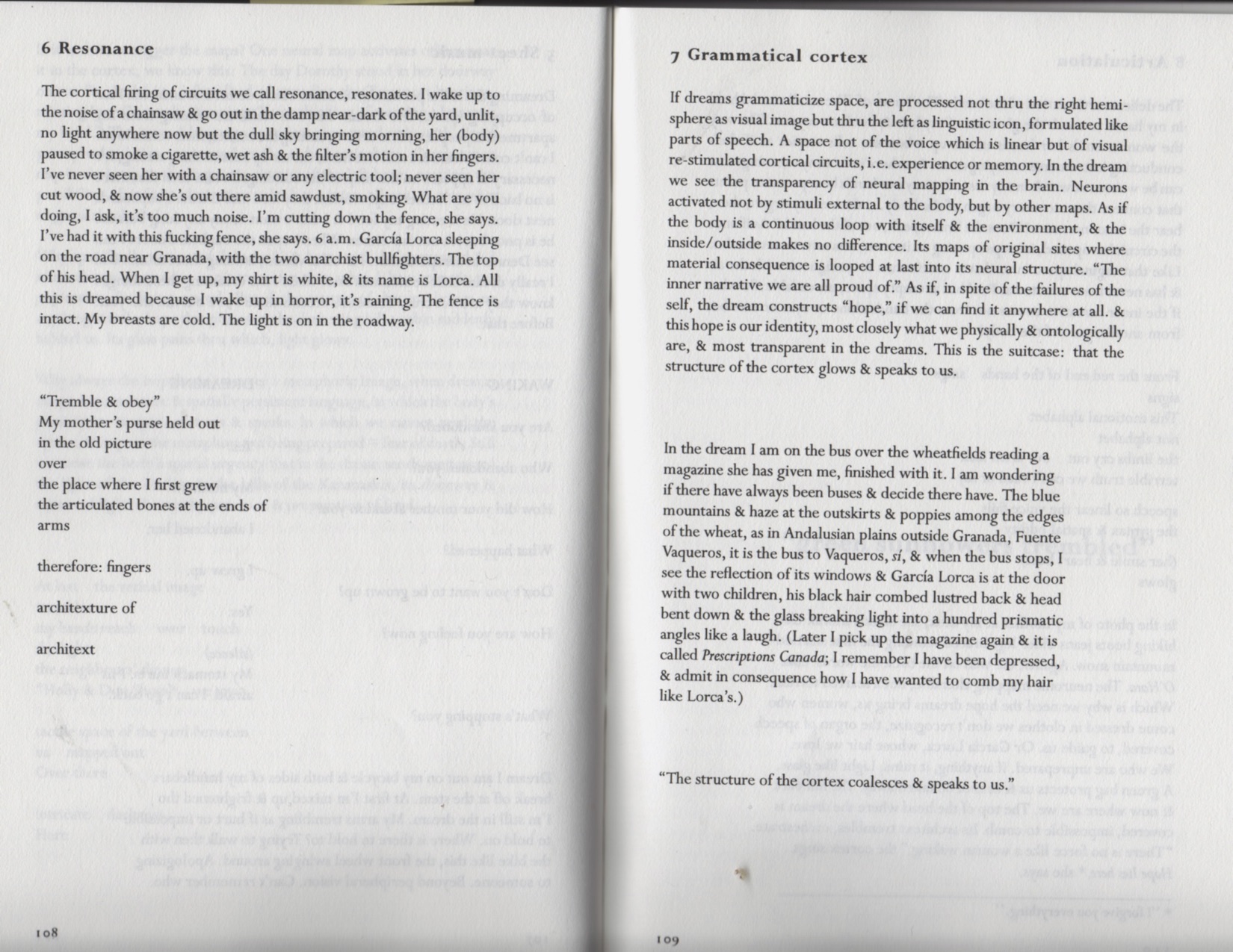 As if dreams were a language that includes the social surface / of the body, ‘signal fire’ in the desert as the song says, the / body’s lamp glowing, armpits & breasts & pectoral muscle. / Signifier. We see our selves moving. In the dream one’s own / body signifies, at least. (But can we read it?)