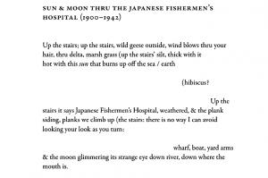 The collection ends with a hanging “because.” This poetry refuses to be tied up—rather, it leaves the thread to dangle, tempting readers to pull. Ultimately, to think of Marlatt’s work as something that can be shaped is to misconstrue its state of matter. Properly, Marlatt’s poetry is liquid, not solid: it fills the vessel it is poured into, but is not formed by it. Though carefully and delicately contained here, it is always prepared to run towards the sea.